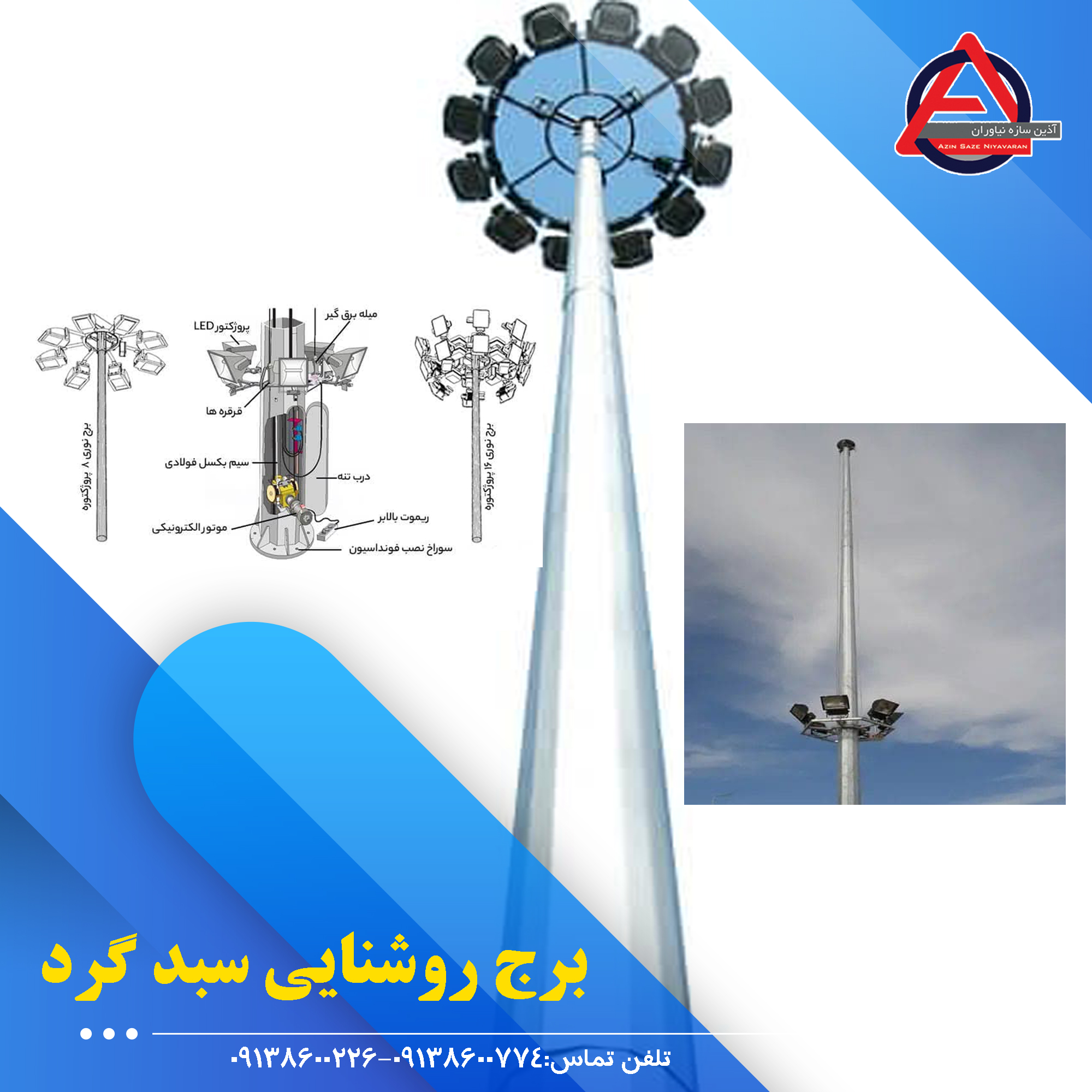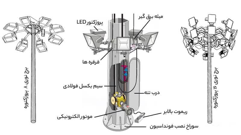 برجهای نوری ۱۲ متری آذین سازه امکان نصب پروژکتورهای متنوع را دارند: