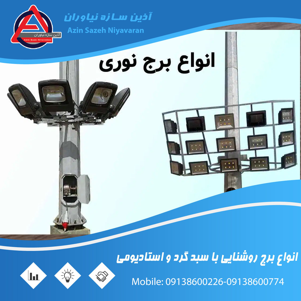 برجهای نوری یا برجهای روشنایی ساخت “صنایع روشنایی آذین سازه”، سازههایی بلند و مستحکم هستند که برای روشنایی محیطهای وسیع و باز مانند پارکها، خیابانها، استادیومها، فرودگاهها، و محوطههای صنعتی طراحی و ساخته میشوند. این برجها از پایههای فلزی با کیفیت بالا و مقاوم از جنس فولاد ساخته شدهاند که با استفاده از چراغهای نوری پرقدرت LED، نور را به صورت یکنواخت و بهینه در سراسر محیط پراکنده میکنند. برجهای نوری آذین سازه به دلیل طراحی خاص و استفاده از تکنولوژیهای مدرن، انتخابی مناسب برای روشنایی فضاهای عمومی و خصوصی هستند.